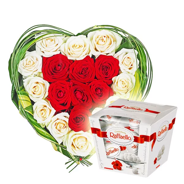 Стандартный: роза белая - 12 шт., роза красная - 7 шт., берграс, листя аспидистры, оазис сердце. + конфеты "Raffaello" - 1 шт.